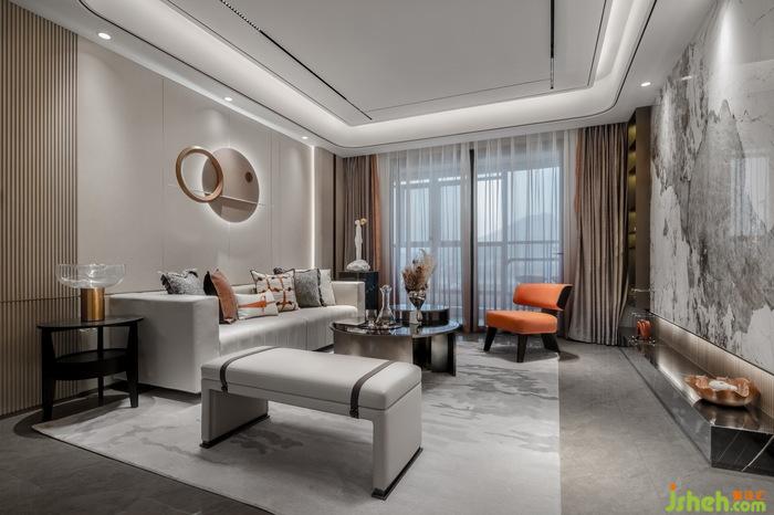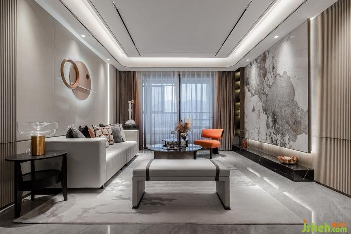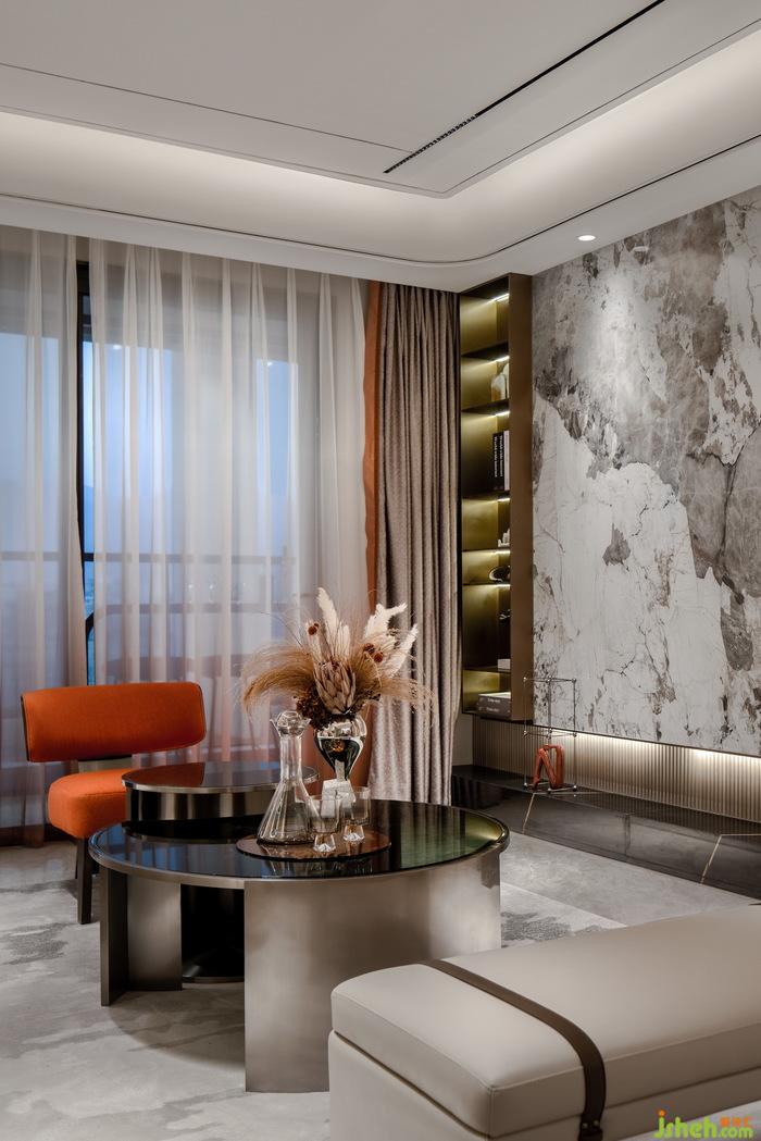 花紋別致的大理石背景墻自然生長,一抹橙色在空間綻放生機(jī),帶來濃濃的暖意。