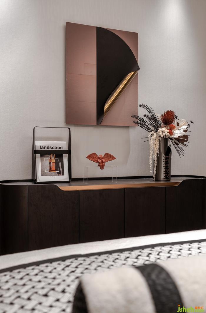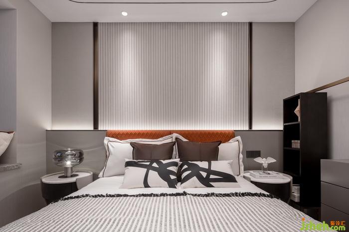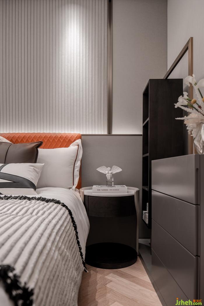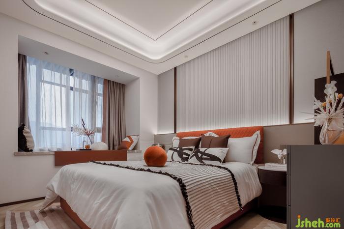 次臥也延續(xù)了空間的溫暖色調(diào),偏橘色的配色讓空間活潑明朗,飄窗上的精致小擺件與床頭的藝術(shù)壁燈空間的藝術(shù)氛圍感,簡潔而不失時尚。