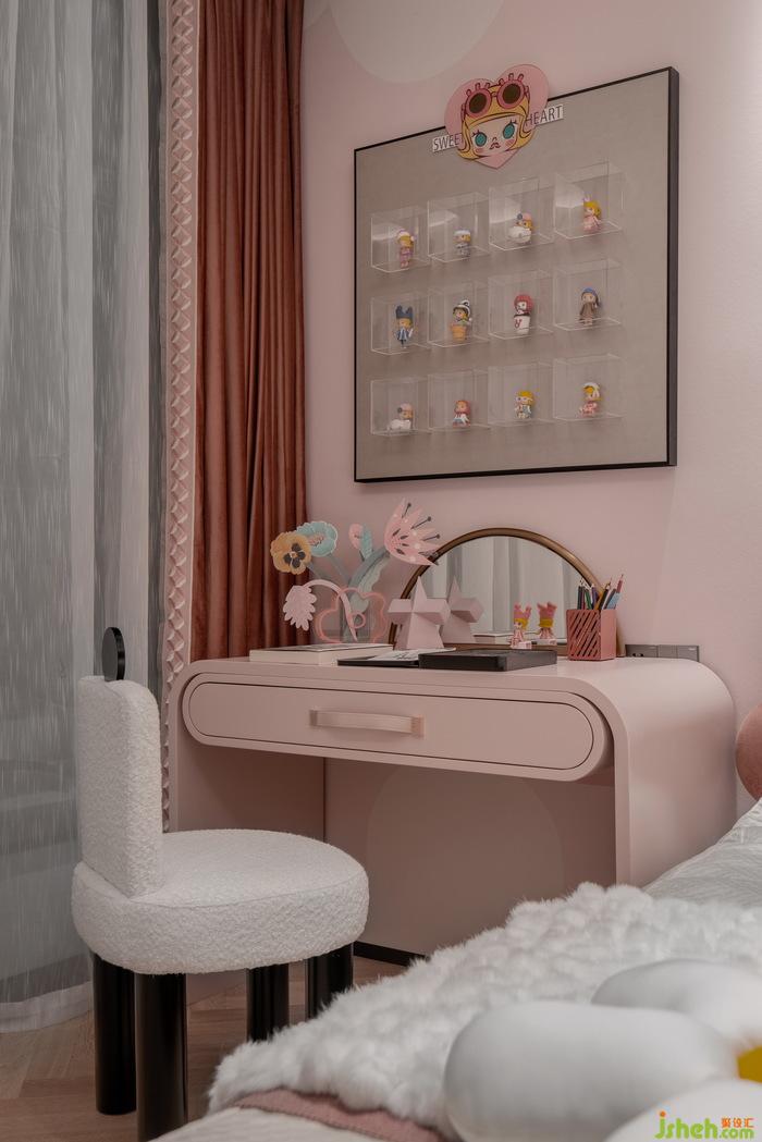 樣板房軟裝設(shè)計以粉色為空間基調(diào)的女孩房溫馨可愛,云朵狀的床頭背景墻充滿童話故事的夢幻感,定制的書桌與精心挑選的玩偶使得整個空間活潑,活力感十足。
