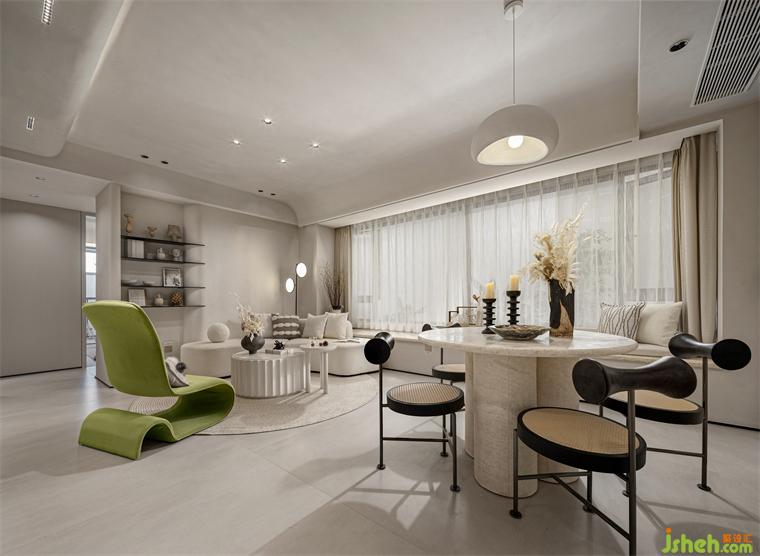 客廳空間的高級(jí)感無(wú)需靠堆砌來(lái)完成,適當(dāng)?shù)牧舭资歉唠A、靈動(dòng)的呈現(xiàn)。樣板間設(shè)計(jì)以自然家居柔美的流線搭配局部疊級(jí)形式,綠色單椅增加了視覺(jué)上的中心性,保留侘寂空間的大氣簡(jiǎn)潔又不失質(zhì)感的美學(xué)格調(diào)。
