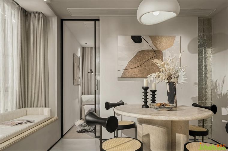 與客餐廳色調(diào)統(tǒng)一,飾物在選擇上簡潔大氣,樣板房設(shè)計(jì)試圖打造材料本身的紋理、質(zhì)感和形態(tài),突出侘寂中更高級(jí)的極簡。