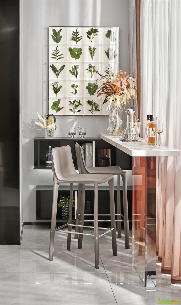 餐廳區(qū)域延續(xù)了客廳的色彩搭配,注重美與藝術(shù)呈現(xiàn)方式,樣板房設(shè)計大理石桌面、精美的花瓶與酒杯共同烘托熠熠生輝的怡人氣氛,展現(xiàn)溫馨雅致的生活情境。在材質(zhì)的紋理、區(qū)域的交界、線面的分割、燈光的溫度和家具顏色的變化上,都可見設(shè)計師的巧妙用心。
