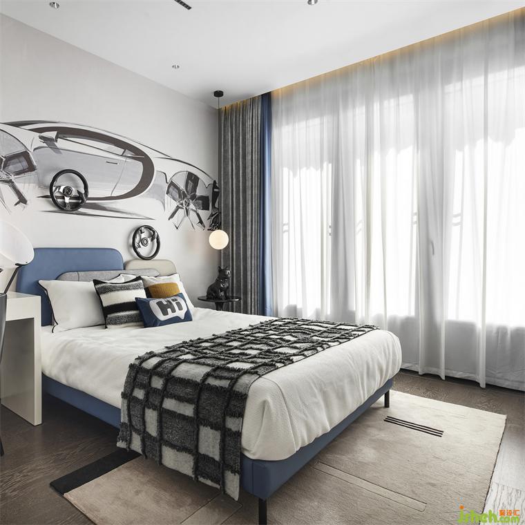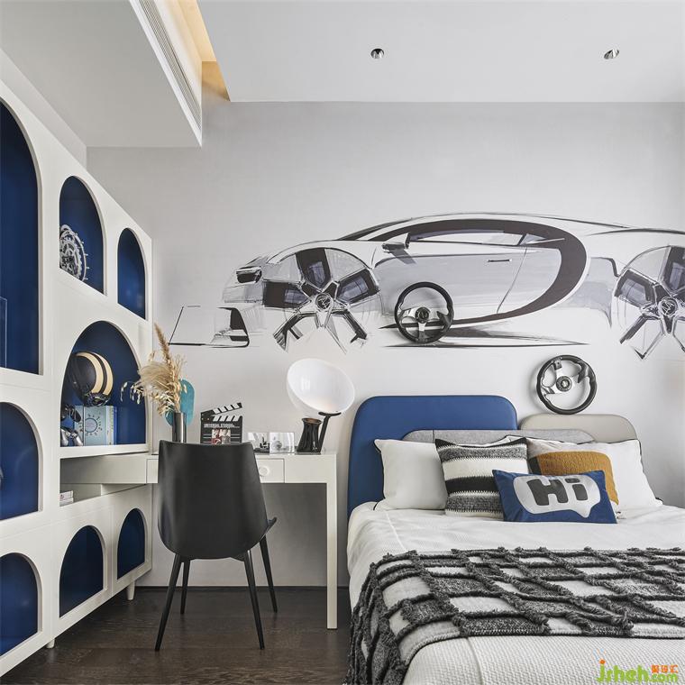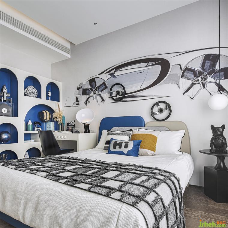 男孩房以快節(jié)奏的賽車(chē)主題,且為慢場(chǎng)景的藝術(shù)演繹而著相立形,一灰一藍(lán),在軟飾中升華趣志。