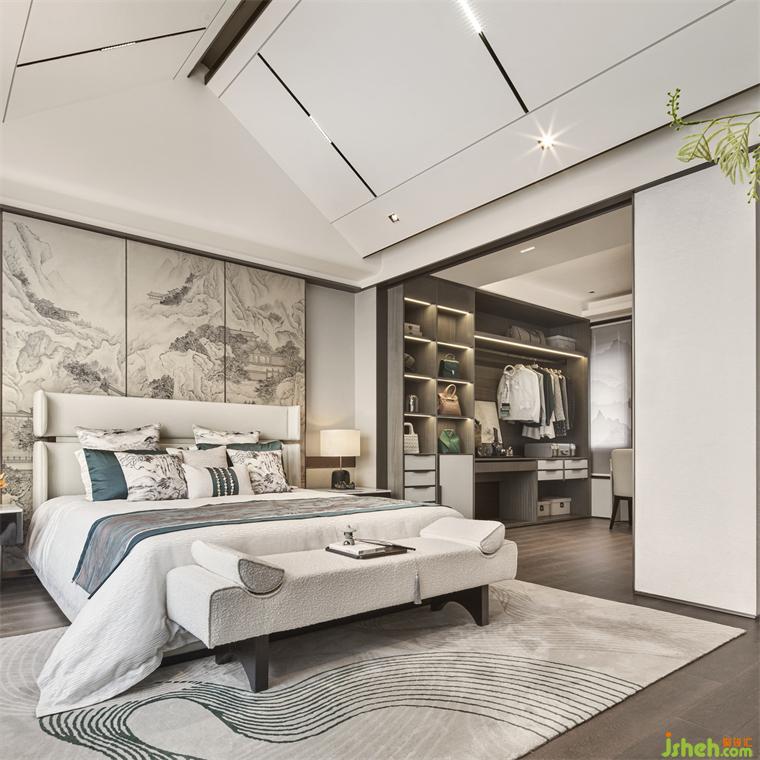 三樓主臥空間,藝術(shù)在這充當(dāng)著審美隱喻的角色,無(wú)形之中溝通著人與人的品位共鳴。別墅軟裝設(shè)計(jì)屋脊之下,繁雜之物被逐一剔除,空間中所余的皆是回歸本真的物象,雅灰調(diào)從休憩區(qū)蔓延至?xí)?、衣帽間,這讓主臥空間時(shí)常被一種經(jīng)典優(yōu)雅的氣質(zhì)所籠罩。