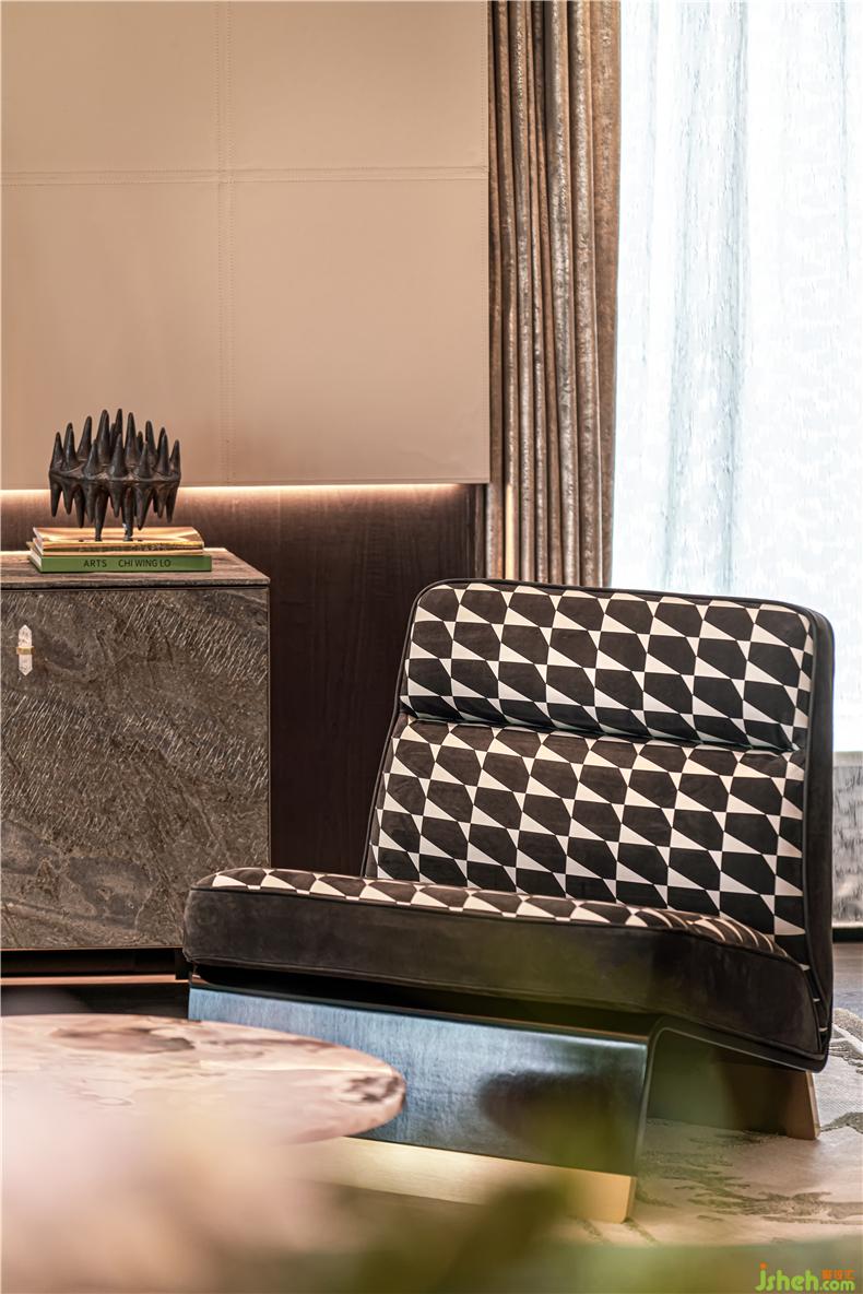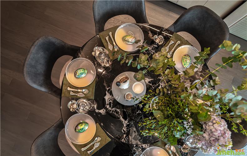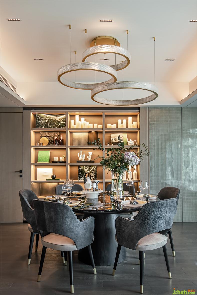餐廳放置的大理石餐桌來自意大利高定,與藝術(shù)裝置背景墻相得益彰,餐椅選自意大利奢華家具新星HENGE,以當代設計手法,帶來略帶復古時尚的奢華感,彰顯大家氣派.