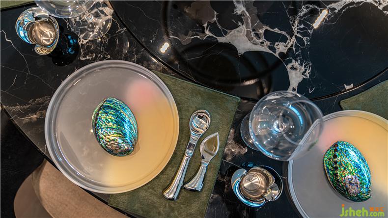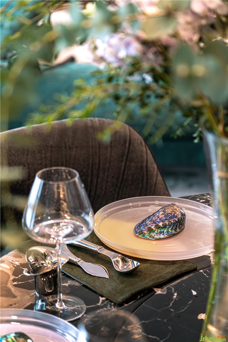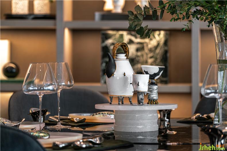餐臺上放置的Studio Formafantasma手工制作餐盤,經(jīng)由乳白色材料吹制出彩色無定形色彩的顏料,質(zhì)地輕透如霧,每件都有獨特的肌理。桌子上的瓷壺和酒壺也是藝術(shù)家制作的。它們是獨一無二的手工制品,充滿了創(chuàng)造力和對生活的興趣。