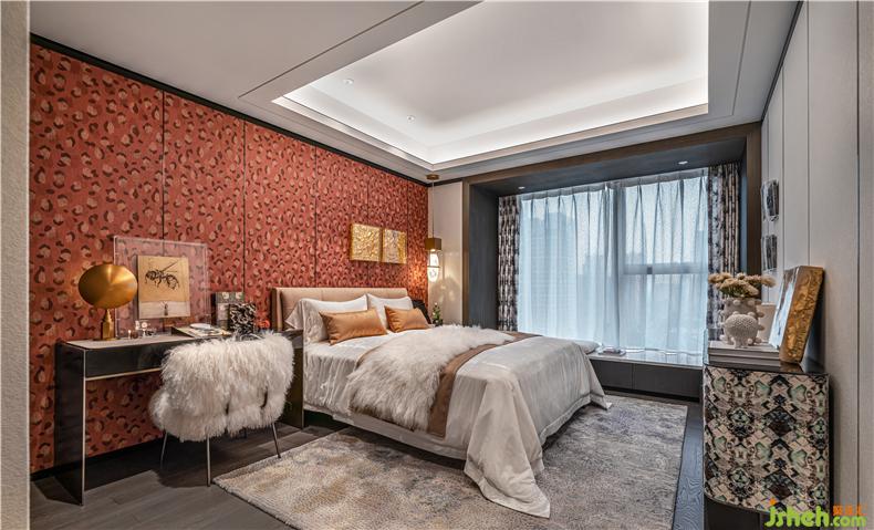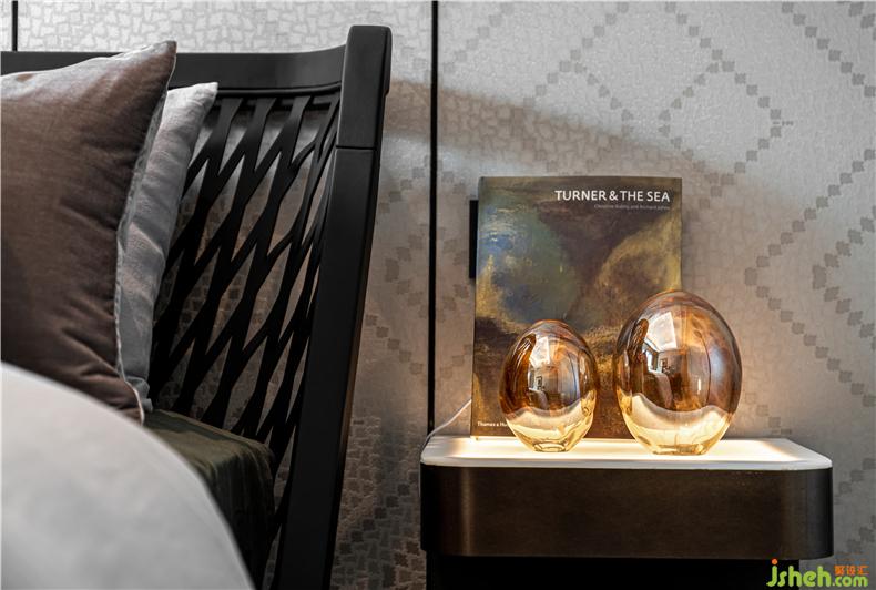 床頭采用大面積的暗紅色蝶影波點(diǎn)Eijffinger墻紙,來自歐洲的百年品牌Hague,以用色大膽、設(shè)計(jì)創(chuàng)新著稱。家具的暗紋亦是以蝶變?yōu)橐庀?,與墻紙呼應(yīng)。