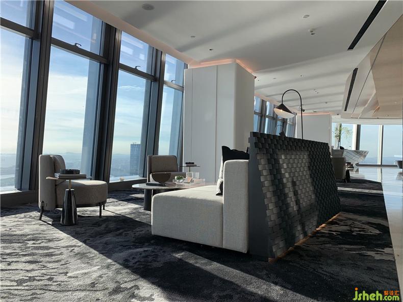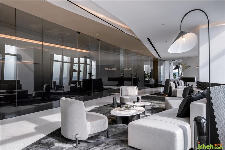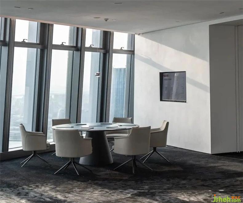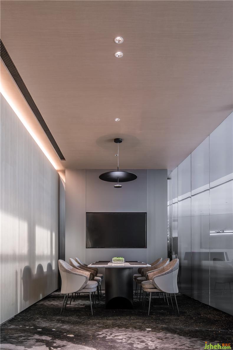 VIP接待室,摒棄了厚實的墻面,采用漸變色玻璃營造通透空間氛圍,辦公室設(shè)計既保障洽談的私密性,又為封閉空間帶來自然采光。黑灰色紋理地毯與米色系家具搭配,帶來舒適與奢雅的氛圍。