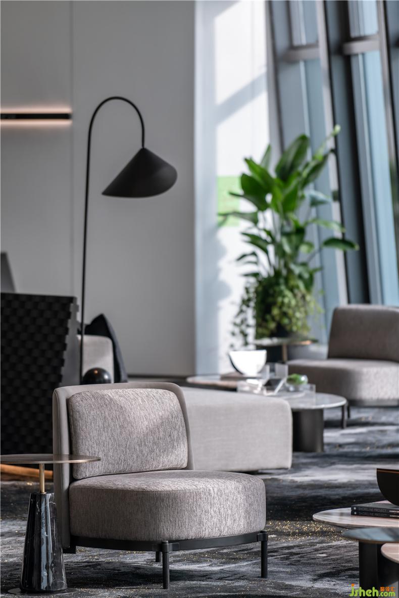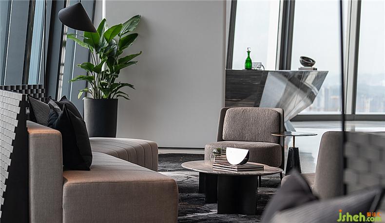 沙發(fā)分組擺放,形成小氛圍洽談空間,家具的選擇與配色簡約典雅,辦公室設(shè)計呈現(xiàn)穩(wěn)重寧靜之感。營造舒適感之外,設(shè)計師亦考究細節(jié),為空間添加亮點。如黑灰色地毯藏有金絲細線,隨光線變化,泛起金沙點點;沙發(fā)背部設(shè)有馬賽克屏風(fēng)靠背,黑色木刻凹凸格紋質(zhì)地,營造半私密間隔氛圍,增加洽談儀式感。