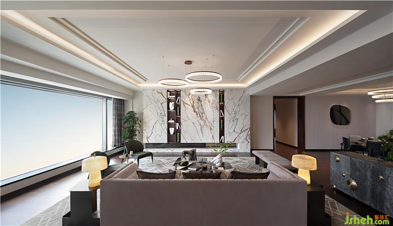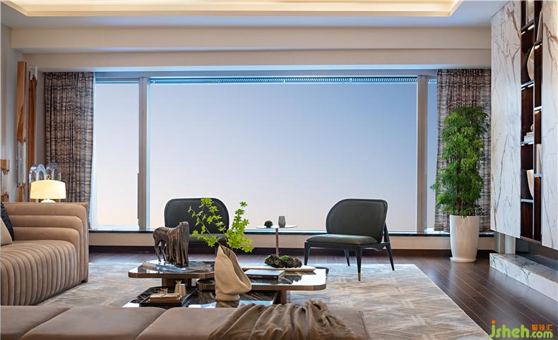 光線,是東方美學空間的重要元素。約383㎡ 的大平層公寓,立于長約13m超寬尺度的窗前,自然光充盈整個身心,Imax視野令人豁然開朗,過往、當下和未來在這里匯聚,靜覽繁華萬象,乘物以游心。樣板房設計