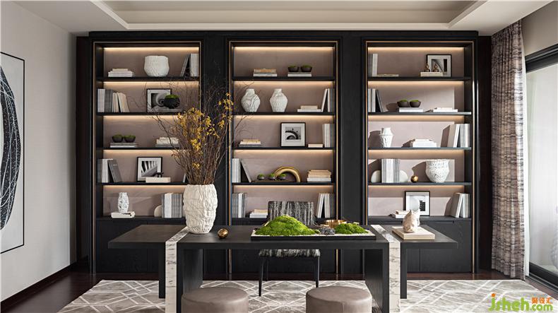 大氣非凡的偏廳,營造禪境的空靈與澄凈。書架在詩意光影中明暗交織、清雋有致,綠意深覆讀書堂,賦予空間獨特的審美特質和精神氣格。