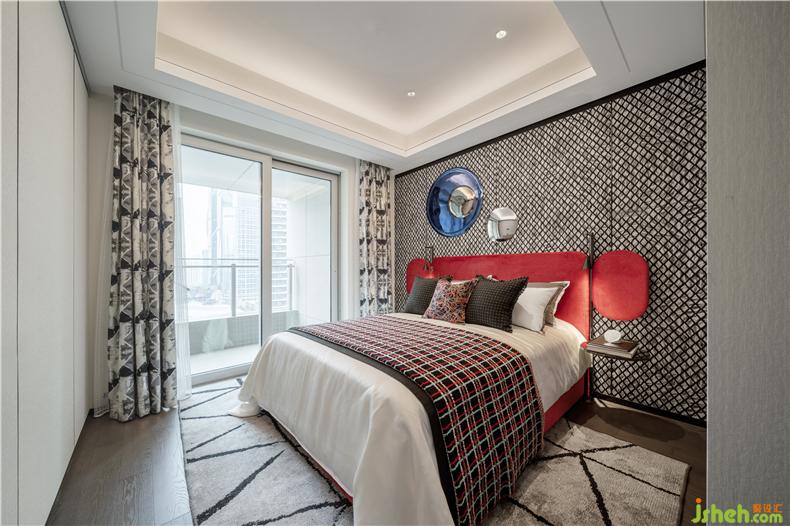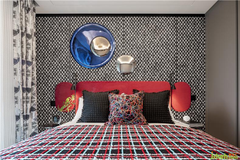 另一套次臥采用紅藍(lán)撞色設(shè)計(jì),熱情與平靜的碰撞釋放愉悅活力之感。樣板房設(shè)計(jì)圓滑流暢的弧線散布于床頭柜、掛飾、床邊柜、燈飾,流動(dòng)而溫柔的藝術(shù)線條完美勾勒出生活的舒適安逸。