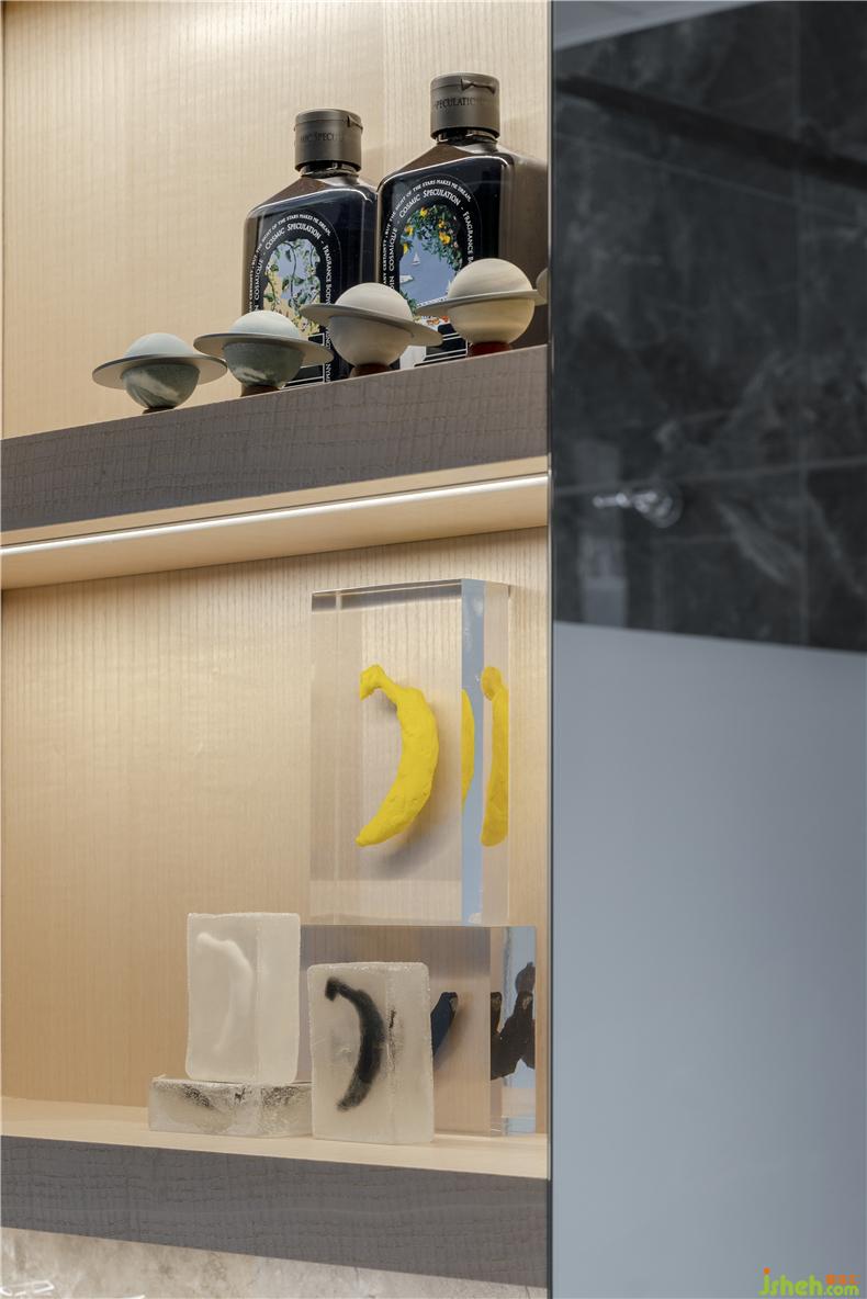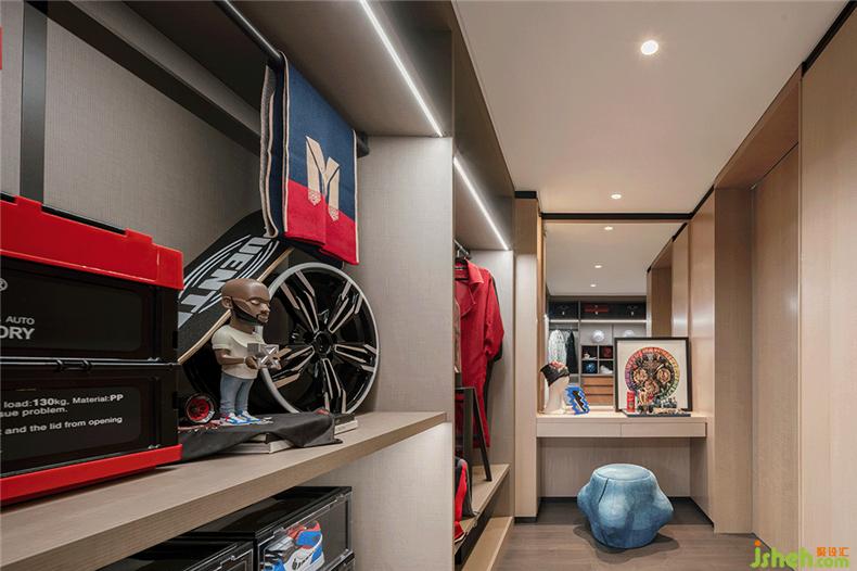 新貴們都是資深的‘時(shí)尚客’。他們對(duì)衣裝絕不盲從,自有一套審美,與此同時(shí),他們的時(shí)尚品位又絕不限于衣服鞋品,各類潮流手辦亦是當(dāng)代都會(huì)新貴的必收藏品。 設(shè)計(jì)師將一間大尺度的步入式衣帽間打造成多功能收納空間,不僅是時(shí)裝廊,也是都會(huì)潮流‘玩家’的手辦收藏室,靜心貯藏的服飾與藏品,陳列規(guī)整,便于挑選與鑒賞。