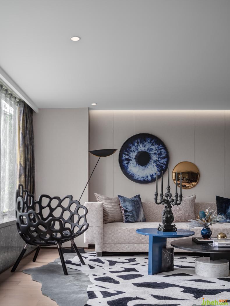 整體設(shè)計(jì)上以色調(diào)沉穩(wěn)的暖灰色為主,配以純凈的克萊因藍(lán)。清新淡雅,樣板房設(shè)計(jì)黑白百搭零差錯(cuò),這樣的色彩組合讓本來的簡單平凡變得別樣精彩。