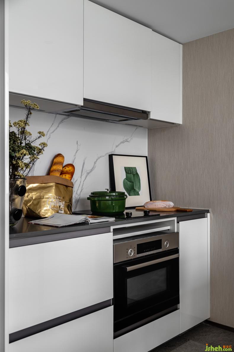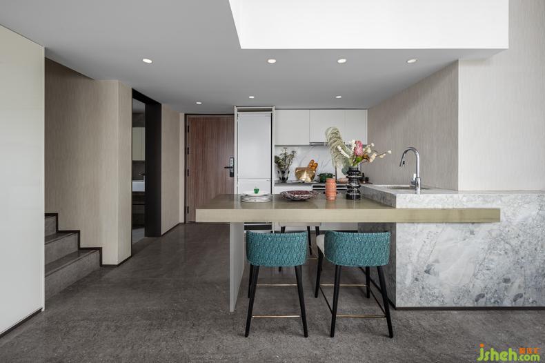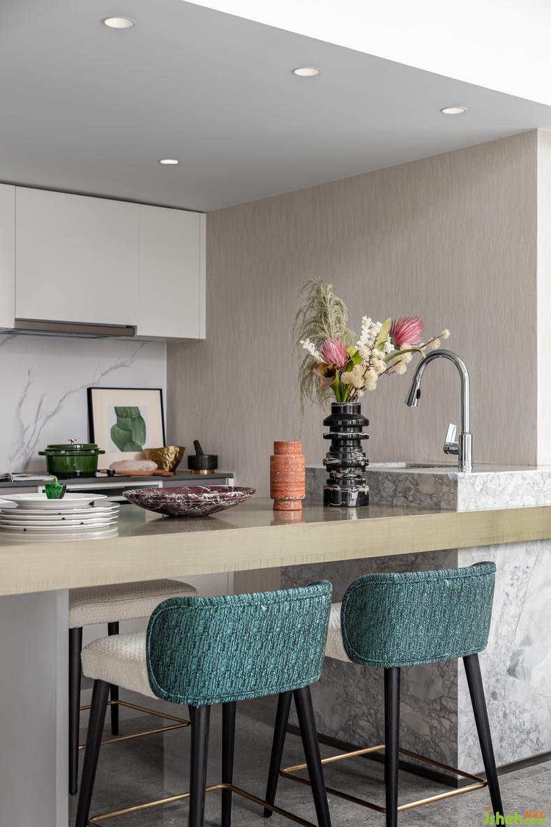 餐廚空間以簡約之風(fēng)構(gòu)造出別具一格的舒適體驗(yàn)樣板房設(shè)計(jì)。開放式廚房將吧臺與廚房結(jié)合,最大化節(jié)省空間的同時(shí)做到擴(kuò)大空間感,增大客廳效果。幾點(diǎn)翠綠穿插交疊,花束生動(dòng)十足,溫馨自然的雅韻之氣在空間蜿蜒綿亙。