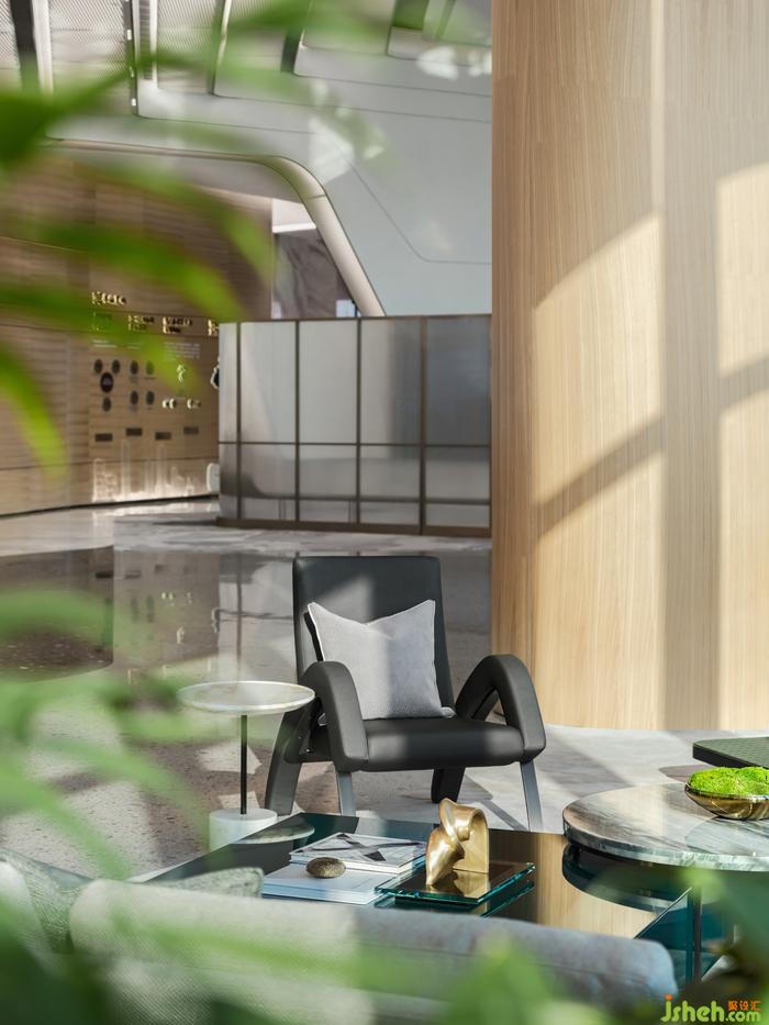 藝術(shù)的自由流動(dòng),構(gòu)建了空間,點(diǎn)燃了氛圍,瀲滟了美學(xué)。前廳接待處以藝術(shù)裝置品引入空間,以形隱喻于境,流動(dòng)的金屬曲線(xiàn)構(gòu)造出別具一格的藝術(shù)形態(tài)