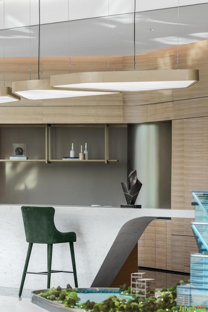 于尺度間見格局,于細節(jié)里尋意趣。蜿蜒的曲線設(shè)計使整個空間更加靈動富有層次。招商中心設(shè)計水吧區(qū)以人造石搭配香檳金,瑩潤剔透,奢雅不俗。