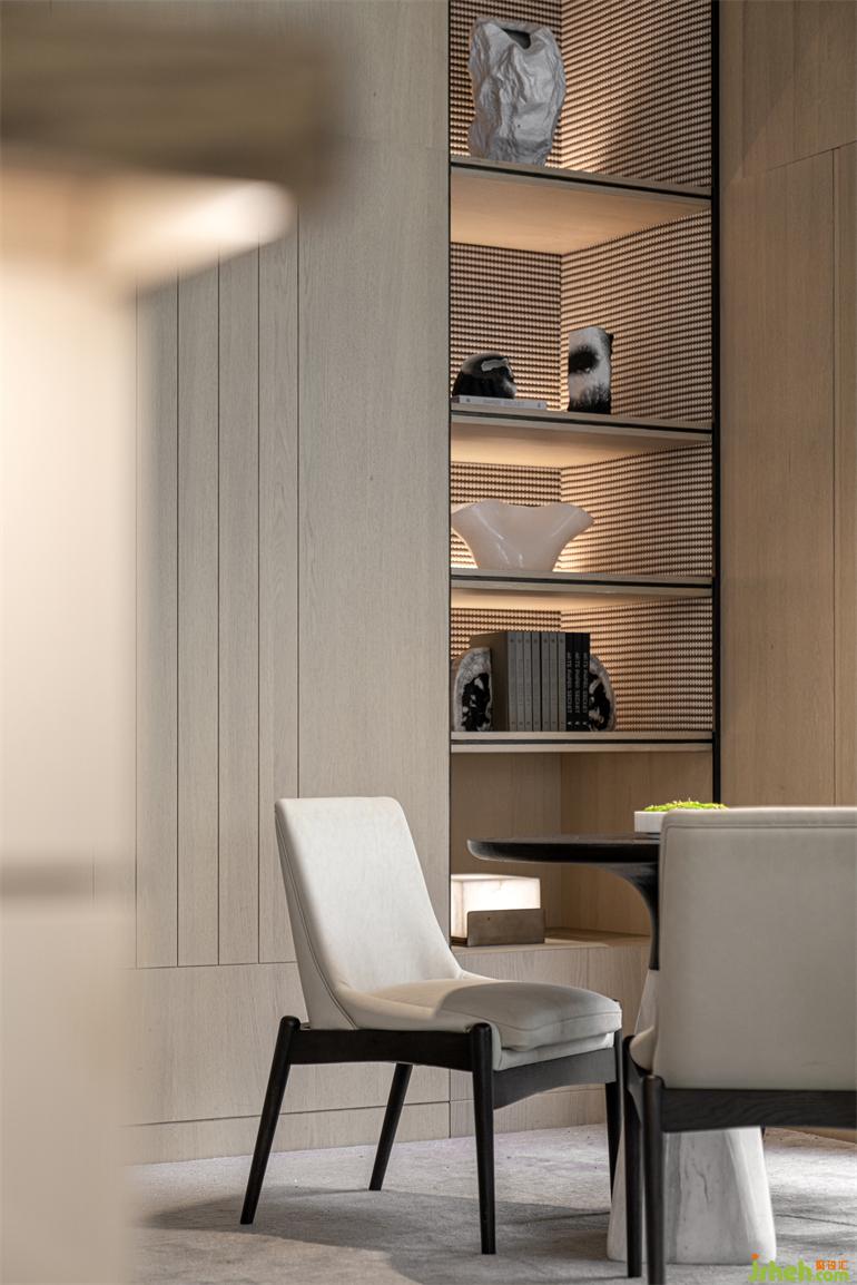 天地之下?lián)頂埲f物,雕塑以柔美的弧形與干凈的線條切割,優(yōu)美而適度的光影變化與室外自然的對應創(chuàng)建時空對話,深圳營銷中心設計形成空間另一記憶點,彰顯居者獨特個性與品味,室內(nèi)設計師致敬自然的魅力無限。