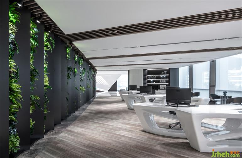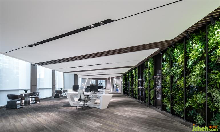 在空間中設(shè)置大面積的綠植墻,讓窗外的景觀及與室內(nèi)空間達成一種交互對話, 給予沉穩(wěn)的空間帶來一幕跳躍氣氛。