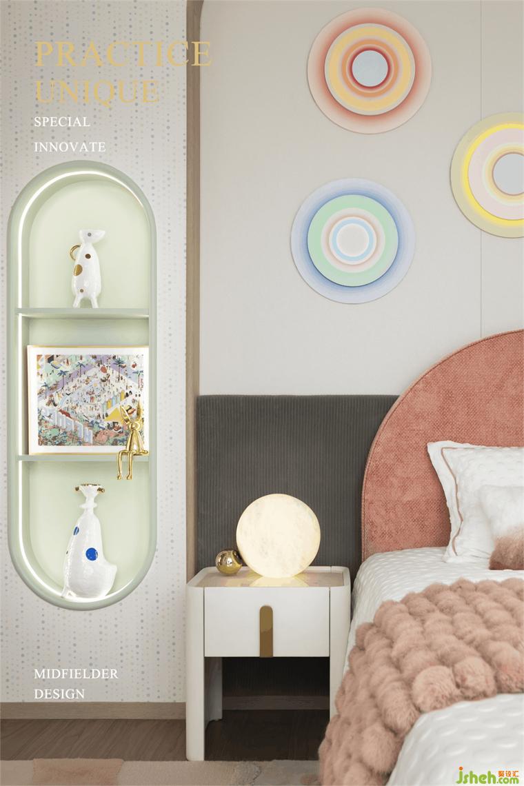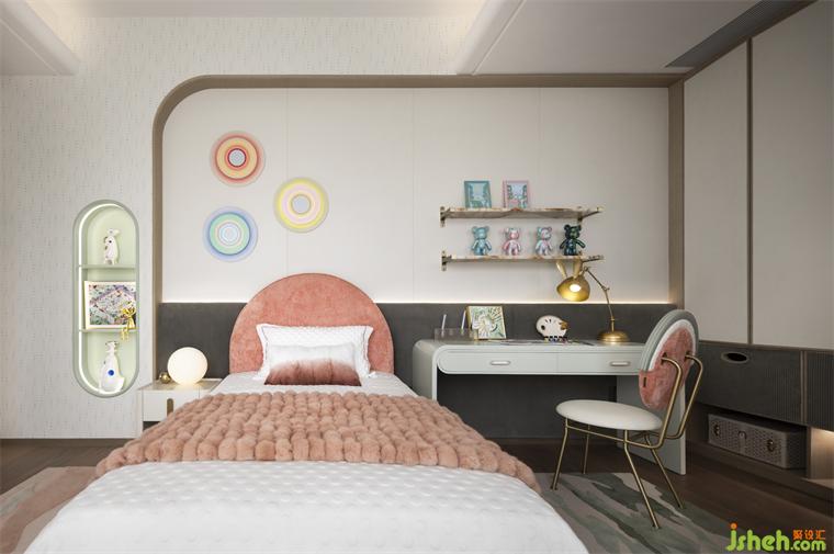 兒童房以藕粉色調(diào)勾勒恬靜的氛圍空間,在此夢(mèng)幻的小世界里,樣板房設(shè)計(jì)承載了小主人繪畫、娛樂、學(xué)習(xí)等需求,居者的藏品規(guī)整且自由地靜置于展架之上,靈動(dòng)而不失童趣,是興趣的陶冶,也是對(duì)世界的好奇與探索。