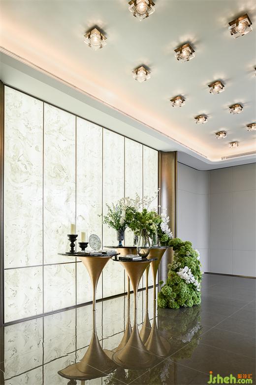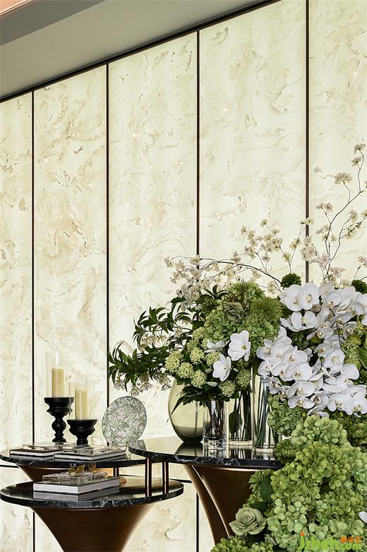 入戶大堂的空間中,水晶燈與大理石牆麵的紋理共同編織出一幅低調奢華的視覺交響曲,樣板房設計金色支架與花卉相映成趣,展現(xiàn)了高端生活的藝術氛圍。