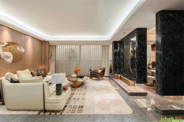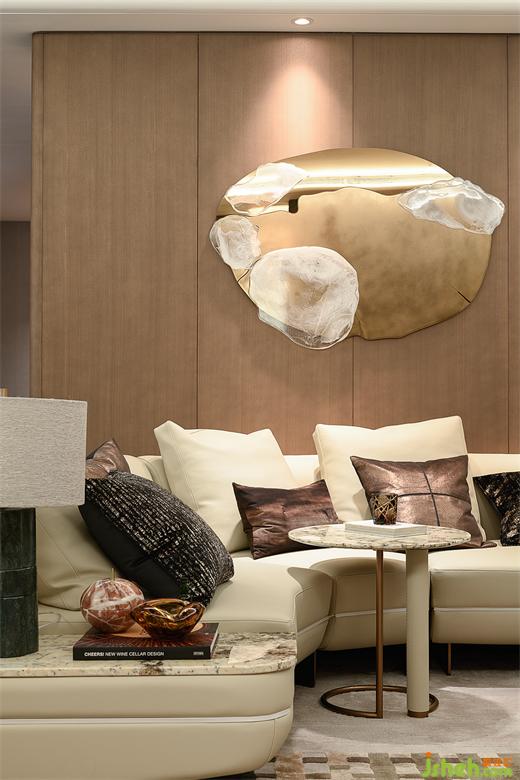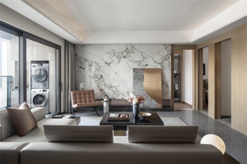 客廳空間以流動的光影與質感交織,微光輕觸,樣板房設計隱喻深沉。簡潔精緻的陳設蘊藏著深厚的文化意涵,既冷峻又溫潤,演繹出無聲的優(yōu)雅與永恆的哲思。