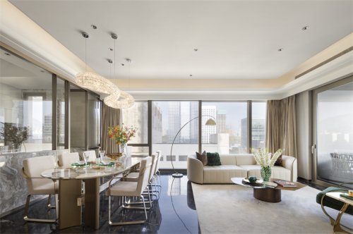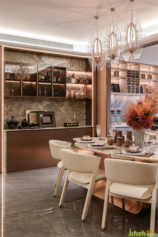 餐廳空間宛如時光中的靜謐角落,燈飾如同懸掛的星辰,樣板房設計將微光散落在精緻的餐桌上,營造出一種如夢似幻的氛圍。