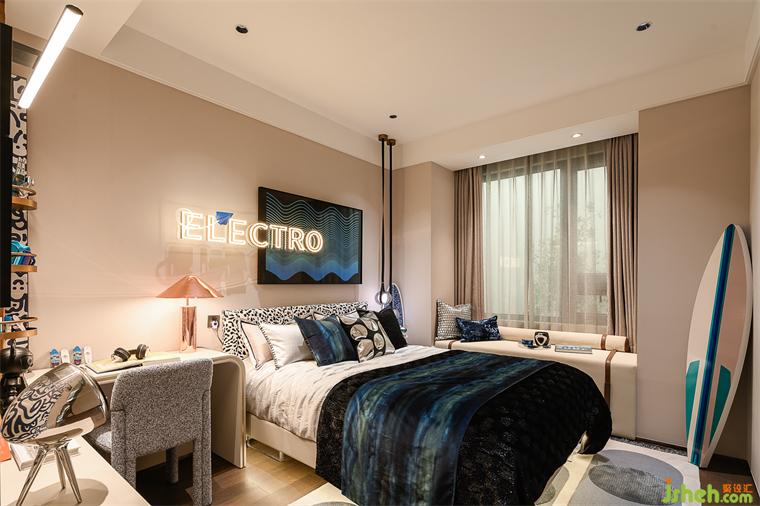 男孩房融合了現(xiàn)代科技感,牆上的霓虹燈文字仿佛爲(wèi)空間注入了一股電流,照亮了青春的能量與無限的可能性。樣板房設(shè)計(jì)床頭的波動線條與房間內(nèi)的衝浪闆呼應(yīng),暗示大自然的律動與冒險(xiǎn)精神在這個空間中悄然流淌。