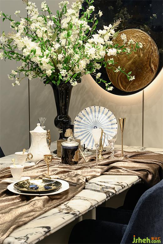 餐廳大理石餐桌上,紋理與奢華的金屬質(zhì)感交相輝映,訴説著古典與現(xiàn)代的交融。樣板房設(shè)計(jì)瓷器在柔和的光線下散髮著低調(diào)的光輝。