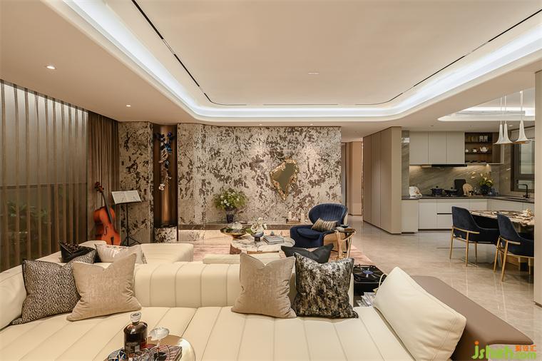 客廳空間如同文化編織,牆麵的大理石肌理仿佛大地脈絡(luò),樣板房設(shè)計(jì)將自然與人文融合,散髮厚重。角落中的樂器仿佛在靜默中低吟,訴説著藝術(shù)與生活的交匯。