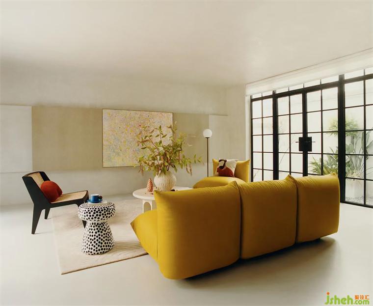 家裝設(shè)計(jì)天然石材的吧臺(tái)與中古感的木質(zhì)餐桌,組合呈現(xiàn)出自然又質(zhì)樸的輕松氛圍,檸檬黃的arflex Marenco面包沙發(fā)點(diǎn)綴其中,搭配波點(diǎn)的小邊幾又為其中注入了幾分明媚明快的度假感。