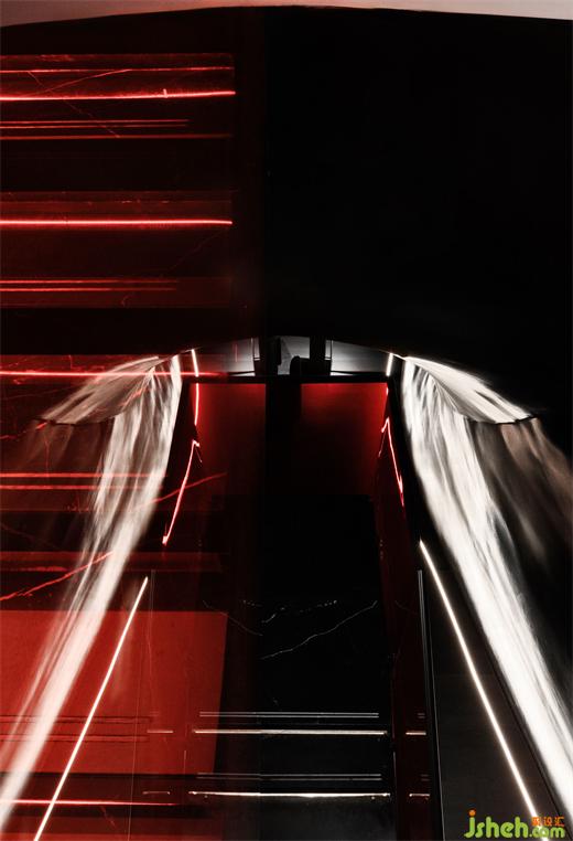 涵洞般的入口被設(shè)計(jì)為一條時(shí)光隧道,讓人想起經(jīng)典科幻電影《2001太空漫游》中的信息流場(chǎng)景。展廳設(shè)計(jì)漆黑光滑的表面上,反射著地面上紅色霓虹曲線的散碎光點(diǎn),模糊曖昧。