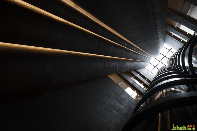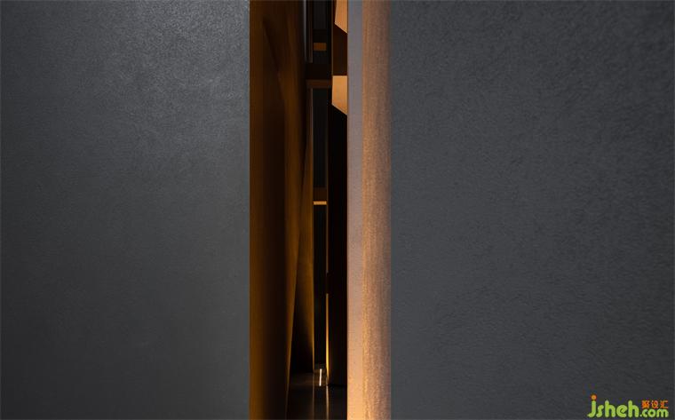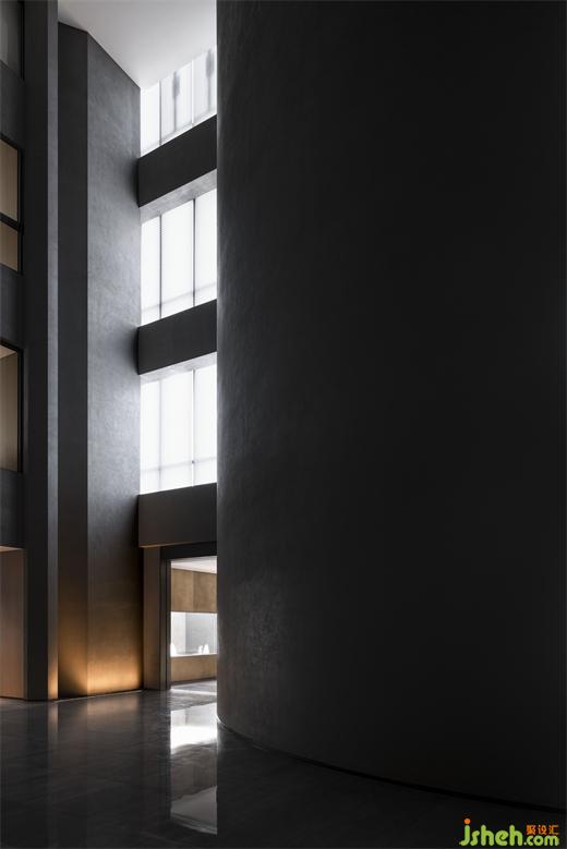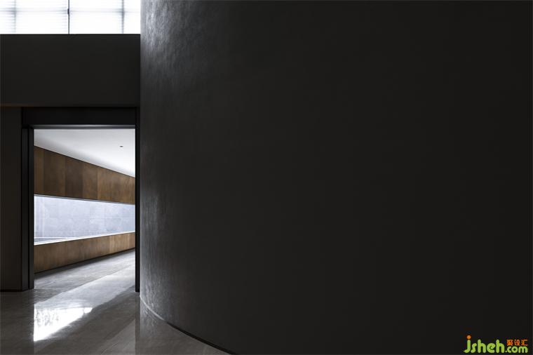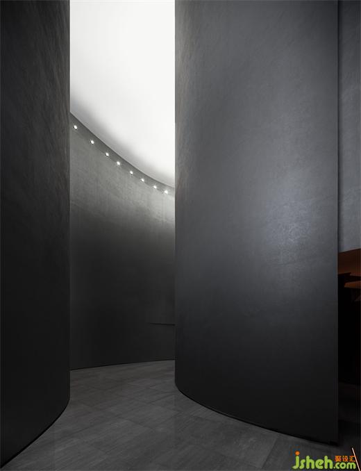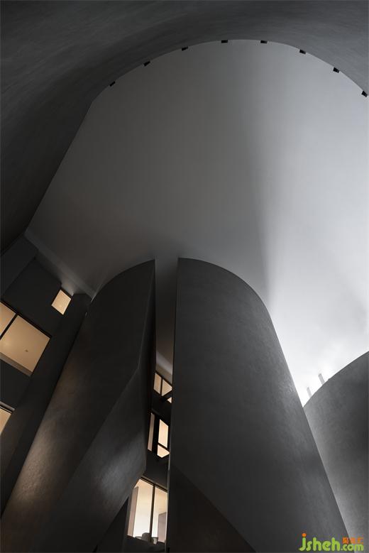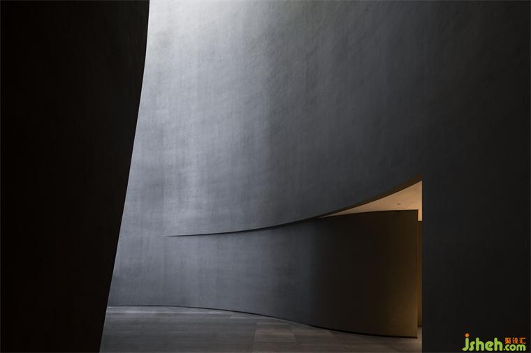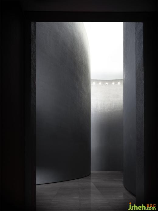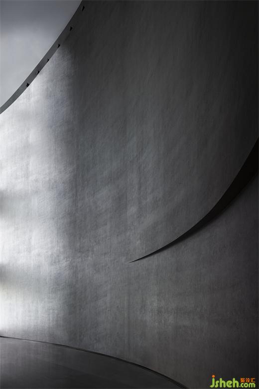 度假酒店設(shè)計(jì)長(zhǎng)長(zhǎng)的弧形墻面如風(fēng)化的山石,尺度宏大、厚重古樸、不加裝飾,具有滄桑的力量感。約四層樓高的極致灰色體量,在寸縷天光的照射下讓人想起信仰空間的神圣以及柏拉圖的“洞穴隱喻”,彰顯出沉靜而深邃的磅礴之勢(shì)。