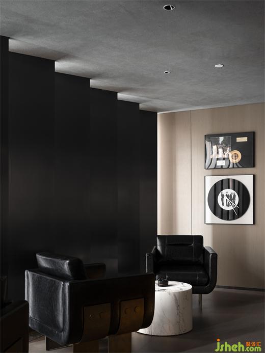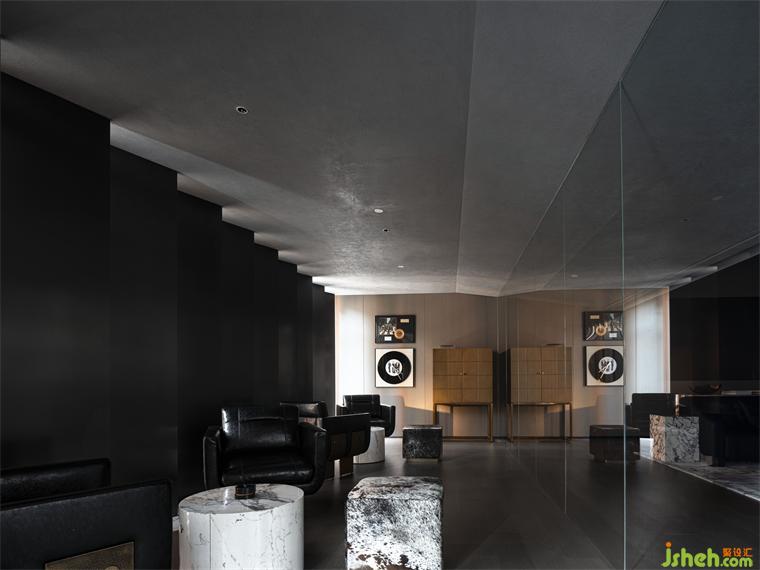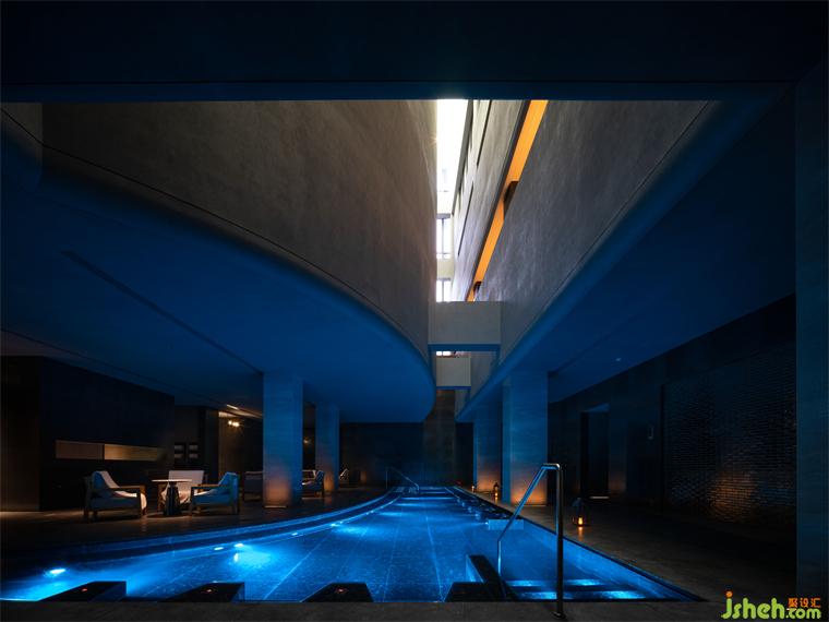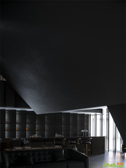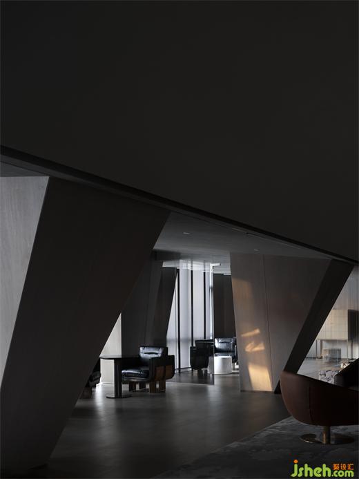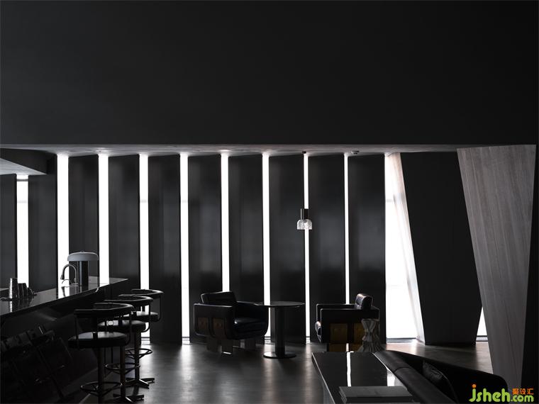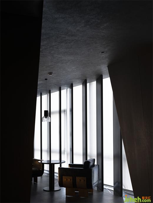 這種人工化的自然氣氛,在三層酒廊體現(xiàn)得更加淋漓盡致。度假酒店設(shè)計倒錐形的巨型方柱仿佛冰島的黑色玄武火山巖,幽暗的光斜斜地漫射在垂直百葉上,堪稱異世之景。建筑立面結(jié)構(gòu)的窄縫將自然光削切成具有方向性的薄片,薄紗般縹緲變幻,仿佛在沉靜地低語。