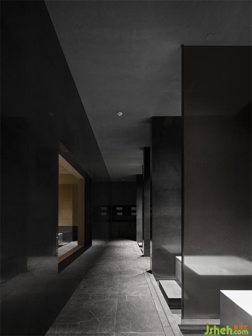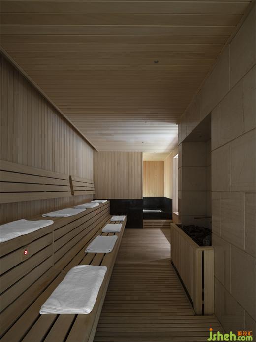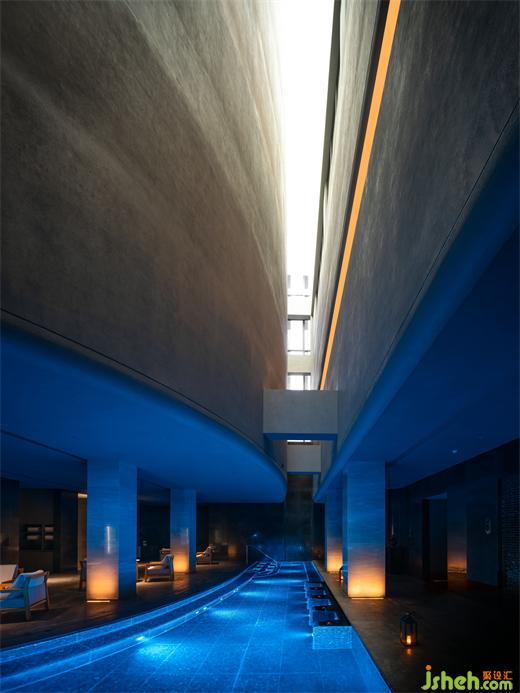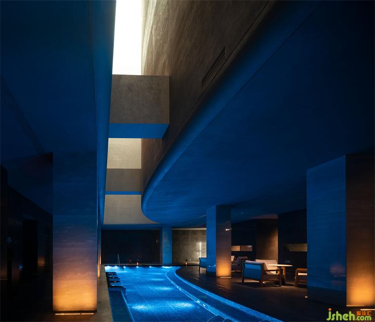 穿過安靜的長(zhǎng)廊到達(dá)地下一層SPA區(qū),人們急躁的情緒也慢慢寧?kù)o下來(lái)。天光經(jīng)過四層過濾滲透到SPA區(qū),清澈無(wú)瑕、溫柔似水。在低矮素雅的弧形天花的庇護(hù)下,在宛若藍(lán)洞的“露天”溫水池畔,從容開啟一段忘卻時(shí)間的身心療愈。