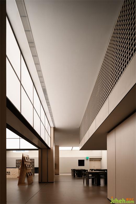 水裹商店的高聳天花下以格柵結(jié)構(gòu)豐富空間層次,柔和的光線籠罩著自由流動的氣息。木質(zhì)展架與金屬展臺形成觸感對比,流動感的雕塑座椅呼應(yīng)著墻面上的藝術(shù)畫作。