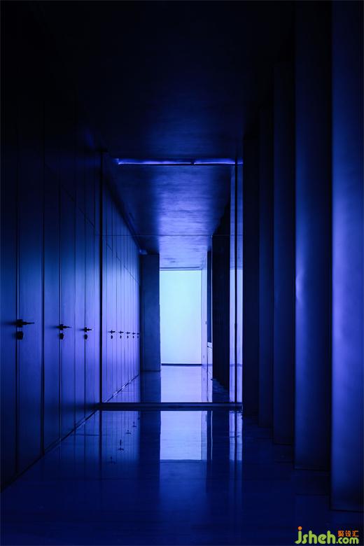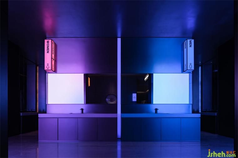 盥洗室以藍粉色柔光籠罩,仿佛科幻中的異次元世界。鏡面材質(zhì)增強了空間對稱感,現(xiàn)實與虛幻交織,既獨立又相互依存。