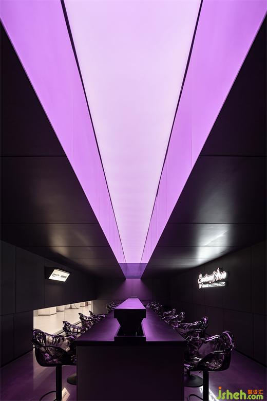 紫色光暈從長條形天花板中灑下,勾勒出具有未來感的吸煙區(qū)。霓虹logo和透明時尚座椅,暗示著一處脫離現(xiàn)實的所在。