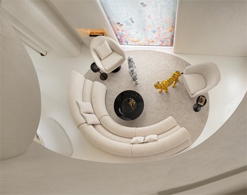空曠洞穴的內(nèi)部,幾乎全是柔軟而美妙的波浪線條,售樓部設(shè)計(jì)形成一個(gè)扭曲虛幻的童話世界。天窗的光透過彩色玻璃,在天頂中心形成了一道富有魔力的漩渦,不可思議的曲線和波浪造型隨時(shí)都會(huì)旋轉(zhuǎn)起來。