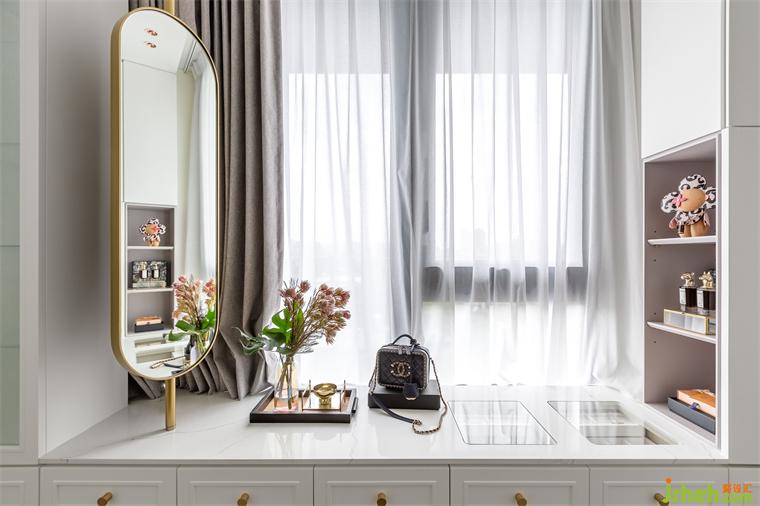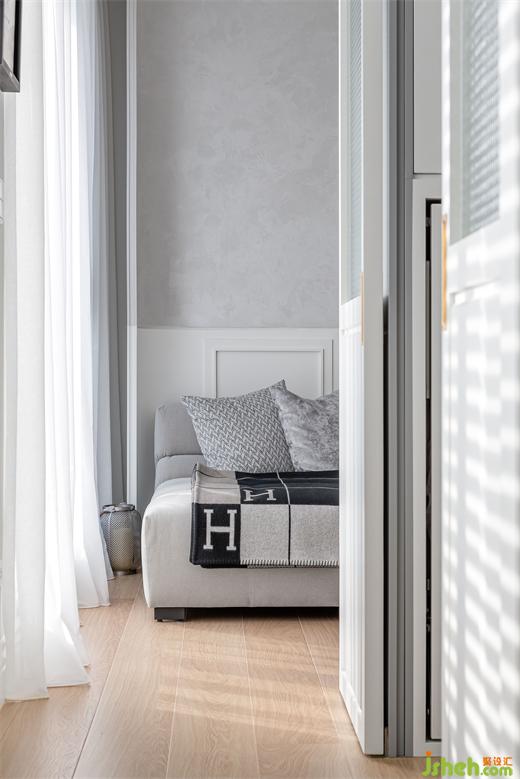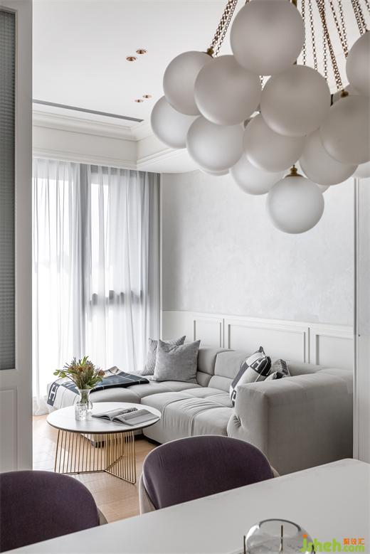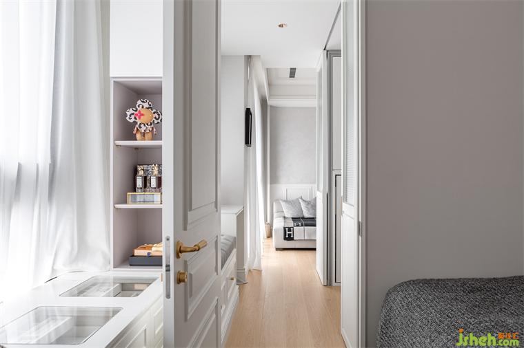 在室內(nèi)18坪的空間里,除了浴室是原有的建商隔間墻以外,兩房?jī)蓮d不但沒(méi)有使用傳統(tǒng)的隔間墻面,而是采用玻璃拉門(mén)結(jié)合木作造型柜體,家裝設(shè)計(jì)將收納最大化之外,同時(shí)也提供必要的隱私。客廳后方與更衣室的隔間,是表情豐富的柜體,一面是客廳展示柜,另一面是更衣室的掀床與衣物收納。面對(duì)單面的落地采光,避免阻礙光線隔斷,使用長(zhǎng)虹玻璃拉門(mén)創(chuàng)造出回字型動(dòng)線。
