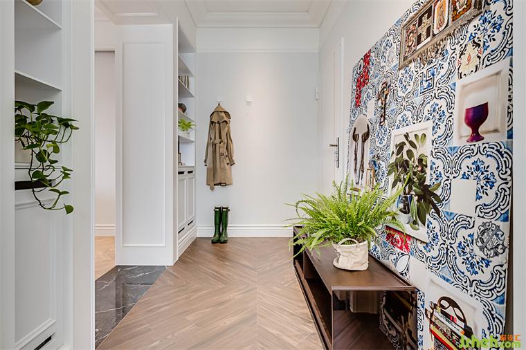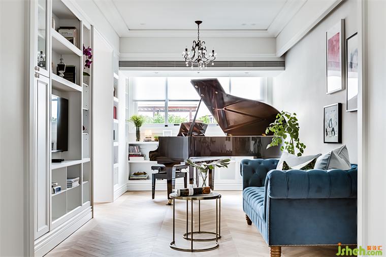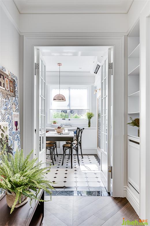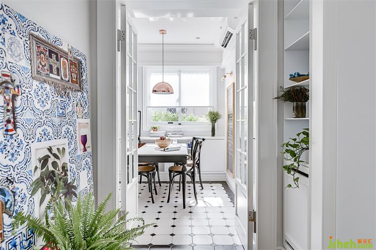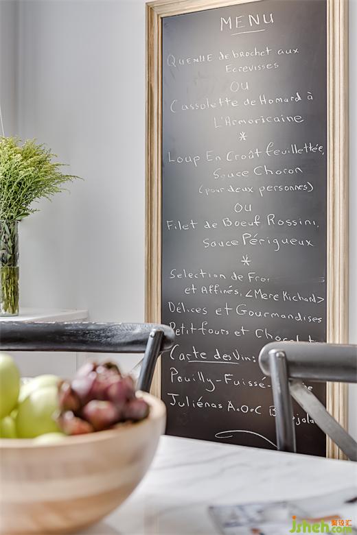 進入客廳之前,玄關左側的法式格子拉門推開,黑白簡約的餐廳跟廚房就在里面。在歐式的生活習慣,餐廳跟廚房是家里的一個重心,家人朋友會坐在廚房,主人就可以一邊準備食物,一邊聊天,增加彼此互動性。在廚房墻壁上掛著訂制的長黑板,上面有著女主人貼心為先生準備的菜單,感覺很像在法式小酒館內用餐,家裝設計這些小細節(jié)營造了浪漫的室內風景。