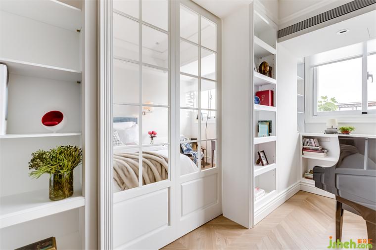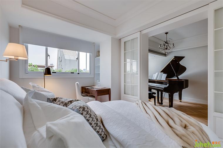 6. 臥室透過(guò)法式格子門看出去,就是女主人鐘愛(ài)的演奏鋼琴,一旁大片的采光讓經(jīng)常需要在家寫(xiě)書(shū)的男主人,備感溫暖舒壓。