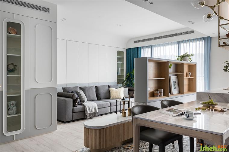 從玄關處進入屋內(nèi),設計團隊將部份墻面重新調(diào)整,設計L字型鞋柜以滿足女主人大量的鞋子收納。鞋柜延深至天花高度,與上梁切齊,形成歐式的拱門入口,浪漫的女主人同時也偏愛法式簡約輕古典,鞋柜門片于是采用視覺性豐富的彎曲線板,勾勒出古典的裝飾氛圍。