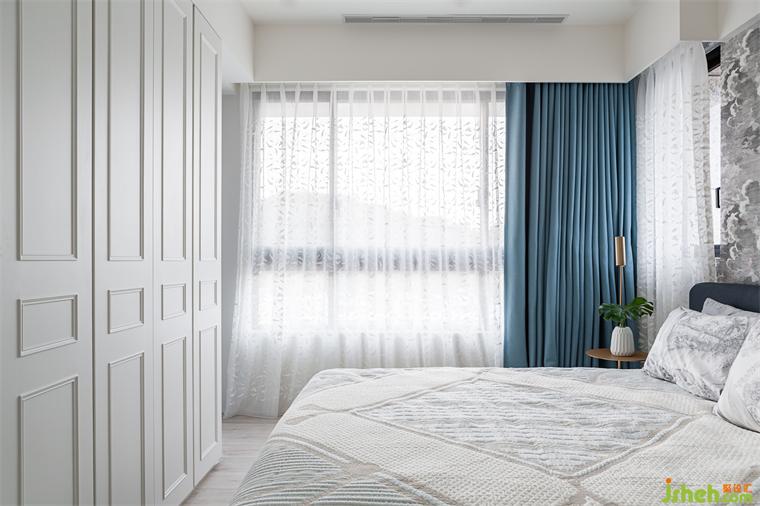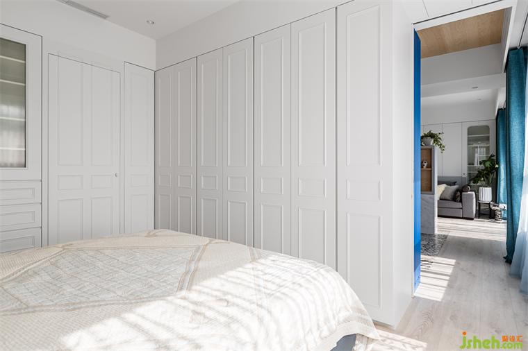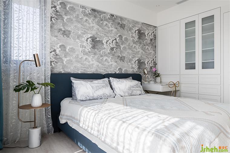 大平層設計團隊將主臥房門移至落地窗的長廊上,利用面窗優(yōu)勢,長排陽光走廊一路從主臥,經(jīng)過餐廳中島至客廳,自然光與窗外延續(xù)的山景成為視覺串聯(lián)。有別公領域的色彩豐富,主臥選用灰白基調(diào),女主人希望在休憩空間也可以營造低調(diào)華麗的舒適感,細致的透花窗紗,精制的浮云圖騰呼應公共空間的活潑地磚,傳統(tǒng)與現(xiàn)代在這里極致混搭。