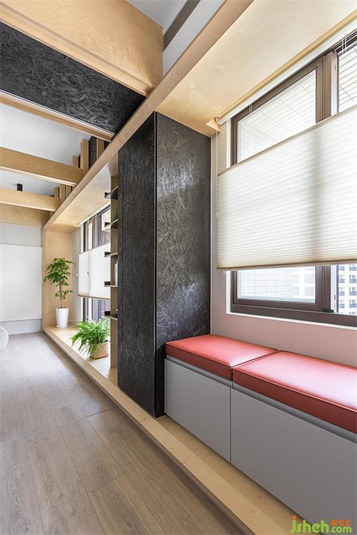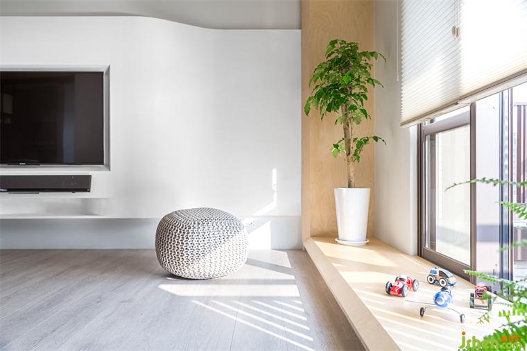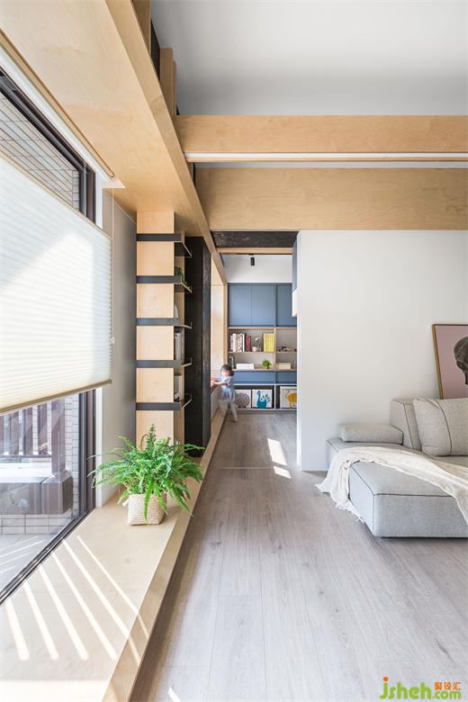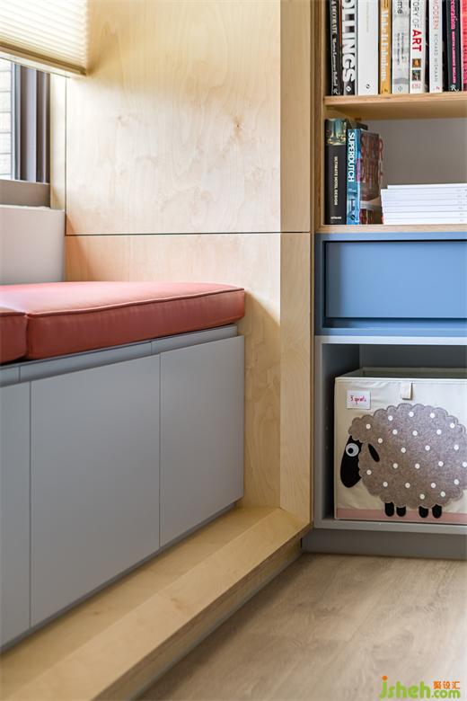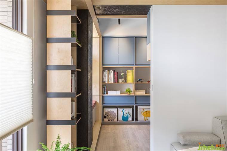 來到客廳后方原有客房,設(shè)計(jì)團(tuán)隊(duì)將部分墻面拆除,改以透光門片代替。業(yè)主在廚房備餐的時候,視覺可以穿透到開放的客廳與游戲房空間,以確保孩童的安全。游戲室一面?zhèn)葔υO(shè)有整面的收納柜,柜體下方留有開放層板,將孩童喜愛的玩具箱放置于適合他們身高的位置,方便他們學(xué)習(xí)自行收納的好習(xí)慣。游戲房另一側(cè)墻面則是配置上柜,下方可以放置活動書桌,將來可輕易變化成孩童們的書房,必要時也能將兩側(cè)滑門關(guān)上,幫助孩童專心于課業(yè)。彈性的調(diào)配空間,使游戲房可以跟隨小主人一同成長進(jìn)化,比起設(shè)于固定單一使用客房更利于其使用價值。