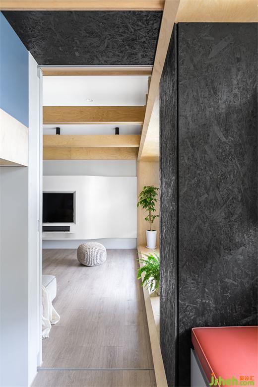 本住宅擁有良好屋高,天花板有趣的設(shè)計(jì)也是本案設(shè)計(jì)的另一大亮點(diǎn)。打斜的天花板實(shí)際上是仿歐式小木屋,豪宅設(shè)計(jì)團(tuán)隊(duì)巧妙的將吊隱式的冷氣機(jī)子隱藏于天花上方,只降低局部天花,并從墻面延續(xù)木屋的直線型木板至天花,色彩上也利用墻面上半部的灰色帶到斜天花,視覺上間接提升了天花的高度。兩種色調(diào)墻面的后方備有一個儲藏室,滿足收納大型推車的需求。現(xiàn)況的兩支上梁橫跨客餐廳與游戲室,設(shè)計(jì)團(tuán)隊(duì)不但不將梁隱藏,還做了另外兩條木作橫梁做為裝飾,延續(xù)歐式木屋的橫梁結(jié)構(gòu)特性,將這三個開放空間串聯(lián)起來。木作橫梁內(nèi)藏LED間接照明,讓光反射到平天花,顯得空間更為輕盈。因應(yīng)廚房和餐廳的實(shí)用性質(zhì),地板材質(zhì)使用六角銀狐磁磚,從玄關(guān)一字形延伸到廚房,也與上方斜天花的邊界相呼應(yīng),巧妙區(qū)分空間性質(zhì)。餐桌上方配置有不規(guī)則垂吊燈,加入黑色元素,與客廳木窗框上方有著一樣的反差色系,給與視覺上極簡,又帶有濃烈對比的立體效果,符合業(yè)主所期待的現(xiàn)代洗斂的北歐氛圍。