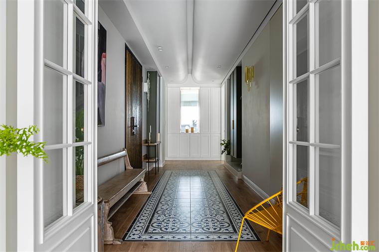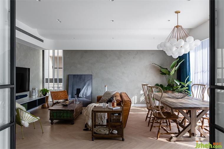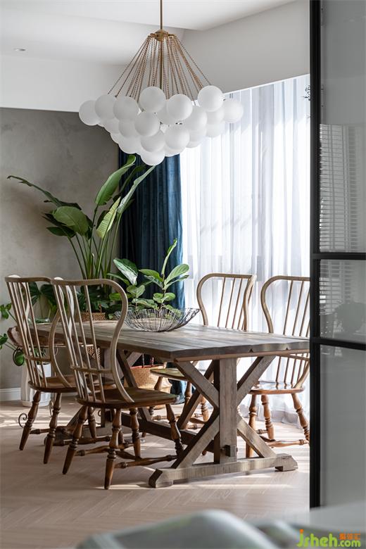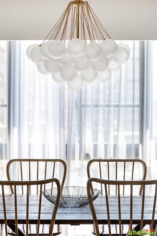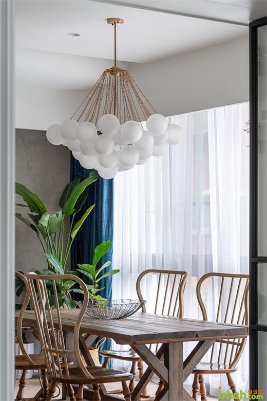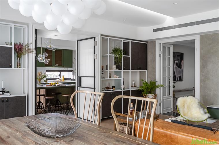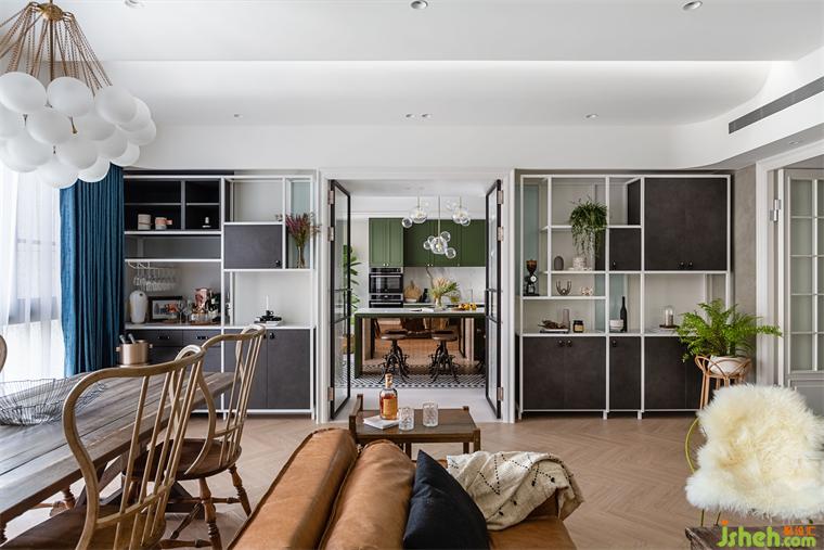 由玄關(guān)進入到客廳,再由餐廳進入到廚房空間,皆使用雙推門方式,搭配男屋主喜愛的黑白灰做為全屋基本配色,餐廳區(qū)塊使用橄欖綠當(dāng)作跳色,金屬色的吊燈系列,營造室內(nèi)慵懶優(yōu)雅輕奢華基調(diào)。現(xiàn)代感強烈的圓弧造型天花從進門玄關(guān)開始,一路延伸到公領(lǐng)域,豪宅設(shè)計柔和的弧形與空間的線條感強烈的古典相互調(diào)和,佐以窗邊灑進充沛采光,讓黑白灰也能很有溫度!
