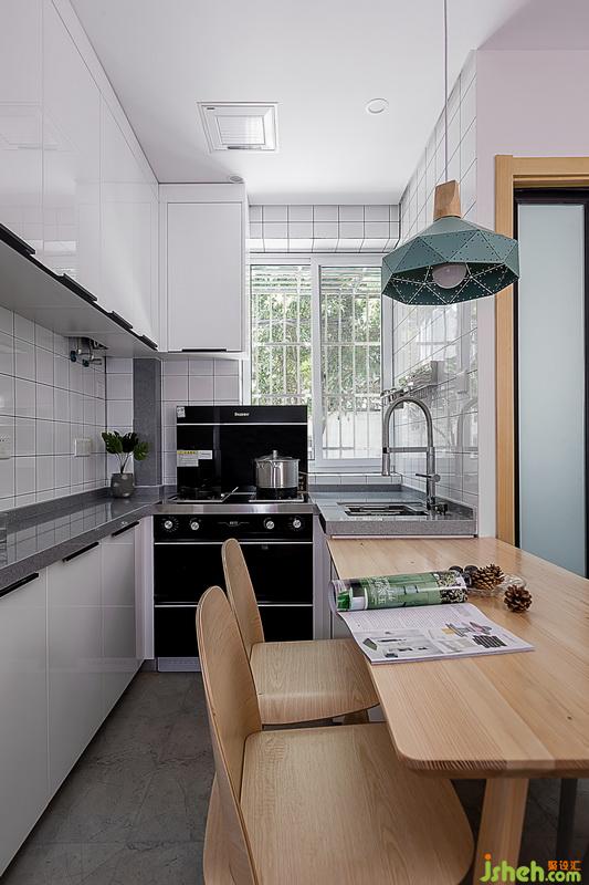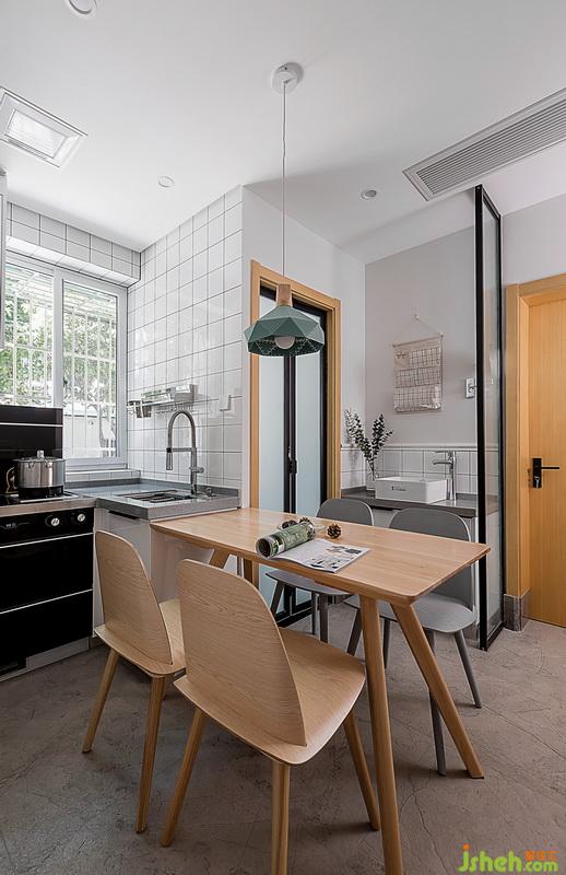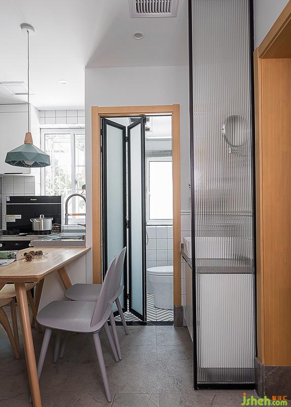▲小戶型設(shè)計(jì)中光合風(fēng)是重中之重,有光才有舒適感,所以雖然燃?xì)庠畹奈蛔釉诖皯粢粋?cè),但是通過選擇集成灶的處理,可以避免壁掛式油煙機(jī)的阻礙,得以保留整個(gè)廚房窗戶的采光和通風(fēng)效果,衛(wèi)生間的門也同樣采用了鋁合金玻璃材質(zhì),一則解決1樓防潮,二則可以借衛(wèi)生間的外墻采光,折疊門的設(shè)計(jì)讓內(nèi)部空間不在緊湊。