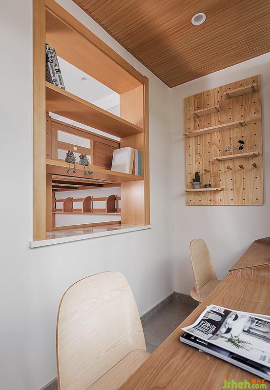 ▲書(shū)房是整個(gè)家里采光和通風(fēng)效果最好的一個(gè)區(qū)域,也是原有陽(yáng)臺(tái)基礎(chǔ)上包含進(jìn)來(lái)的空間,在功能上滿足閱讀、儲(chǔ)物、書(shū)籍、裝飾等綜合作用,而在效果上也更加貼近原木色系,以后兩位寶寶可以再這里完成他們的學(xué)業(yè),陪伴共同成長(zhǎng)。