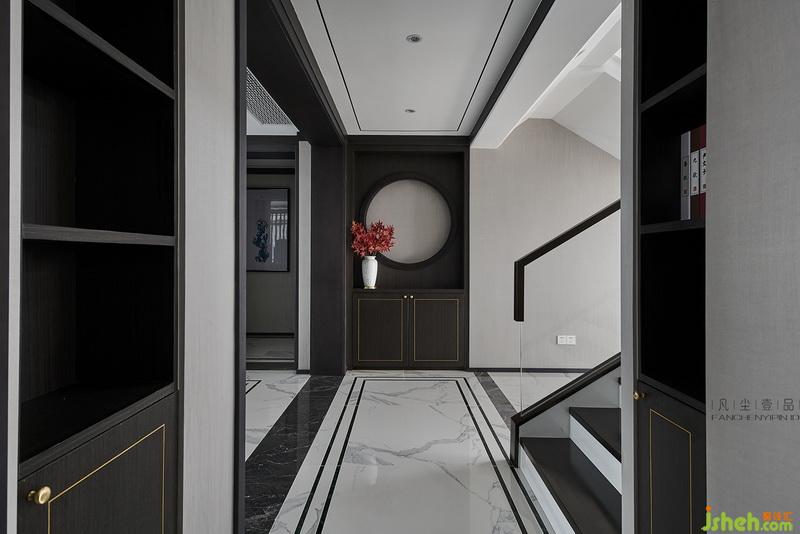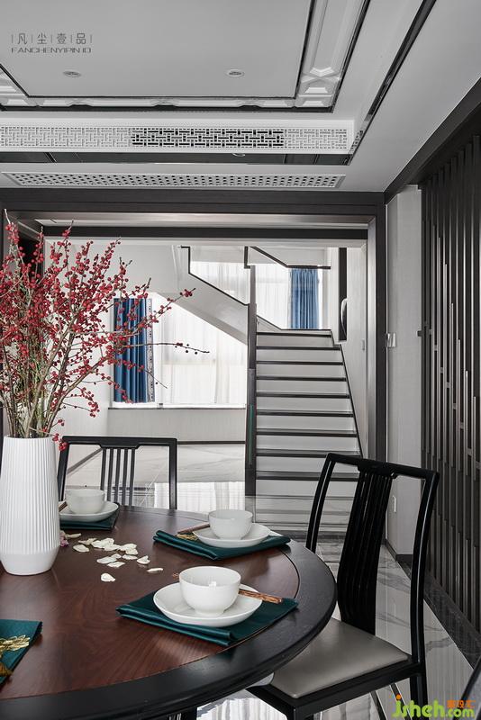 1到3層的回型樓梯設(shè)計,又恰到好處毗鄰全明落地窗,讓整個室內(nèi)空間和中庭豁然開朗,鋼化超白玻璃扶手,搭配黑白相間階梯,用現(xiàn)代氣質(zhì)硬裝意境之美,讓空間顯得更通透和闊達(dá),配合整面通高柜體,猶如一幅潑墨的山水畫卷,給人飄逸的東方韻味。